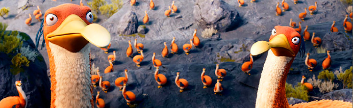 Una pareja de torpes aves intenta proteger como puede sus huevos de una erupción volcánica.Los tres espacios de la melancolía